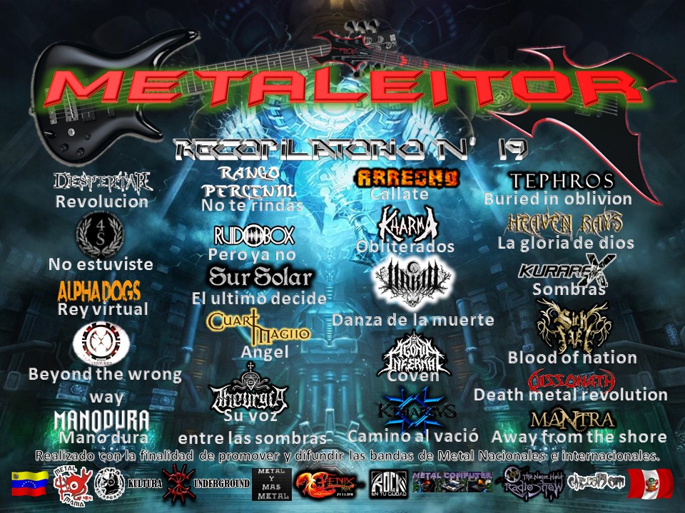 Ya esta disponible la edicion numero 19 de METALEITOR en esta edicion encontraras lo mas reciente de la produccion de nuestras bandas venezolanas como 4 SIGNOS AGONIA INFERNAL ALPHADOGS CUARTO MAGNO DESPERTAR DISSONATH FINAL CENTURIES HEAVENS RAYS KHARMA KTHARSYS KURAREX MANODURA MANTRA RANGO PERCENTIL RUIDOBOX SICK FEEL SUR SOLAR TEPHROS THEURGIA y como invitada internacional la Banda LLAKIQ de peru como siempre agradecemos a todos los que hicieron posible esta edicion y desde ya puedes descargarlo y disfrutar de estas excelentes bandas.
