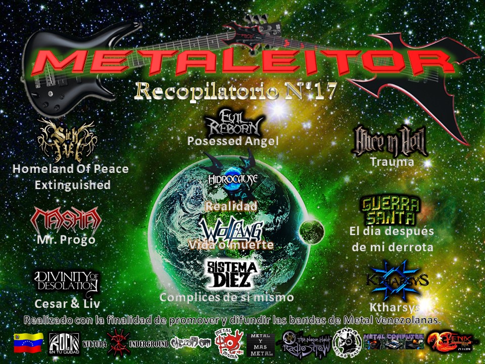 Gente del metal ya esta disponible en libre descarga la edición numero 17 de bandas venezolanas de METALEITOR en esta edición de nuestros recopilatorios están las bandas ALICE IN HELL, DIVINITY OF DESOLATION, EVIL REBORN, GUERRA SANTA, HIDROCAUSE, KTHARSYS, MASHIAJ, SICK FEEL, SISTEMA DIEZ, Y WOLFANG. Agradecemos y felicitamos a estas bandas por el excelente trabajo que vienen realizando, demostrando mucho profesionalismo, con sus temas mas recientes, así que