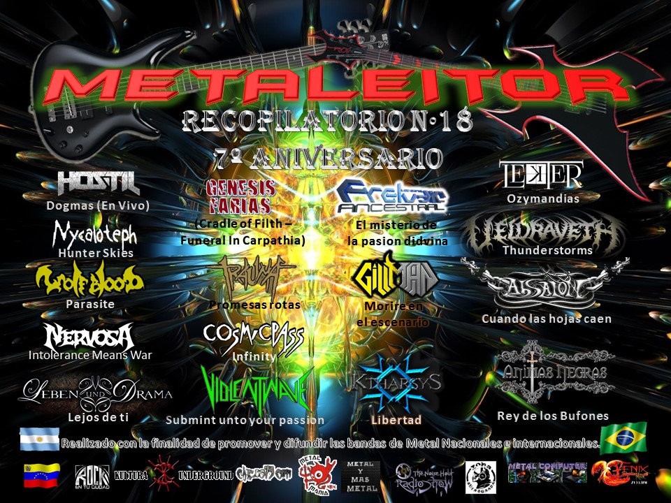 Bueno gente del metal ya esta disponible en libre descarga la edicion numero 18 del recopilatorio de METALEITOR celebrando su 7º aniversario en internet, en esta edicion contiene 2 temas de bandas latinoamerinos como NERVOSA de Brasil y PRELUDIO ANCESTRAL de Argentina, ademas 14 temas de excelentes bandas venezolanas como ABSALON - GILLMAN - HOSTIL - COSMIC PASS - KTHARSYS - LEBEN UND DRAMA - LEKTER - NYCALOTEPH - ANIMAS NEGRAS - TRAUMA - VIOLENT WAVE - WOLFBLOOD y el proyecto de GENESIS FARIAS excelente vocalista, nuestra intension con estos recopilatorios es proyectar a nuestro talento nacional a nivel mundial para que sean conocidos y escuchados fuera de nuestro pais y colocarlas a nivel de cualquier banda internacional, como siempre agradecemos a las bandas que hacen posible el trabajo que realizamos y seguiremos realizando no nos queda mas que decirles que descarguen y disfruten de este recopilatorio que hemos realizado para todos ustedes.